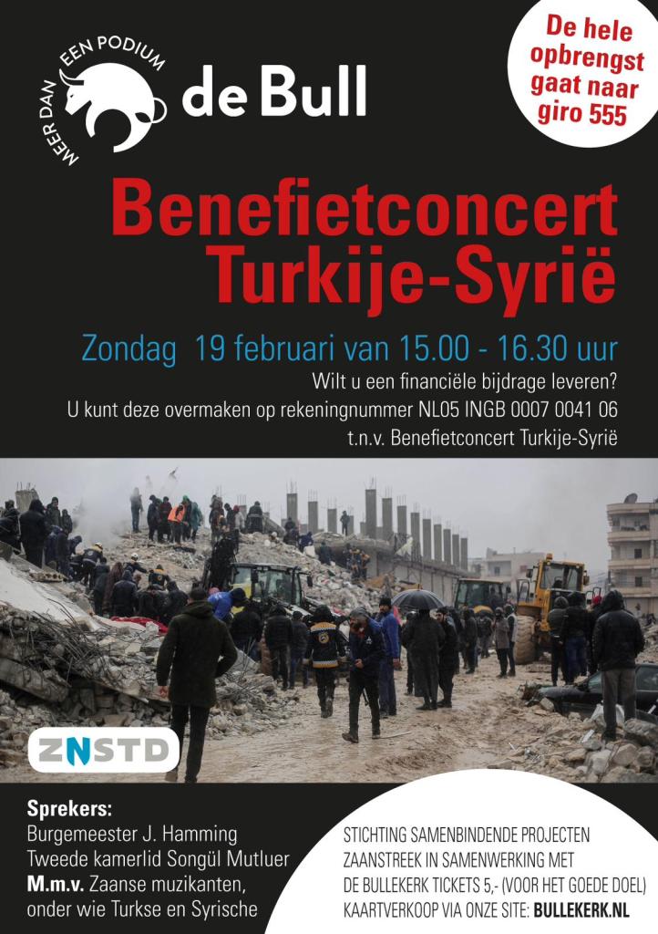 Aanstaande zondag 19 februari organiseren wij daarom samen met Cultureel Centrum Bullekerk een benefietconcert voor de slachtoffers. Sprekers zijn onder meer burgemeester Jan Hamming en Tweede Kamerlid Songul Mutluer. Ook is er muziek van van Turkse en Syrische muzikanten.